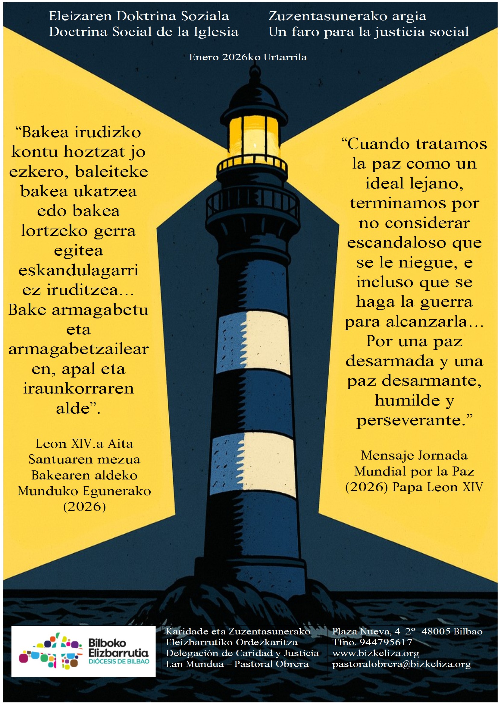 Pastoral Obrera y Pastoral de Migraciones retomaron el pasado mes de diciembre una iniciativa, que comenzó en 2013 de la mano de Pastoral Obrera y que a lo largo de estos años ha tenido diversos formatos: el Faro de la Doctrina Social de la Iglesia (DSI), a través del que se distribuyen diferentes frases significativas de la DSI. En este mes, se centra en la jornada del 30 de enero por la No Violencia y la Paz: cartel aquí.