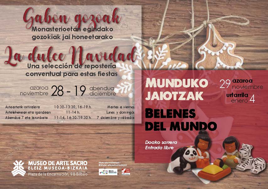 Mañana se inaugurará la muestra de "Belenes del Mundo", en el Museo de Arte Sacro/Eleiz Museoa. La exposición (con entrada libre) permanecerá abierta hasta el día 4 de enero. Además, esta misma tarde abre sus puertas, en el mismo museo, la feria "Dulce Navidad" con repostería conventual. La feria de dulces estará instalada hasta el 19 de diciembre. Por otro lado, hoy también se inaugurará la exposición de belenes, organizada por la Asociación Belenista de Bizkaia, en el Museo de Pasos, de la calle Iturribide. El obispo, Joseba Segura, estará presente esta tarde en la inauguración de esta muestra.