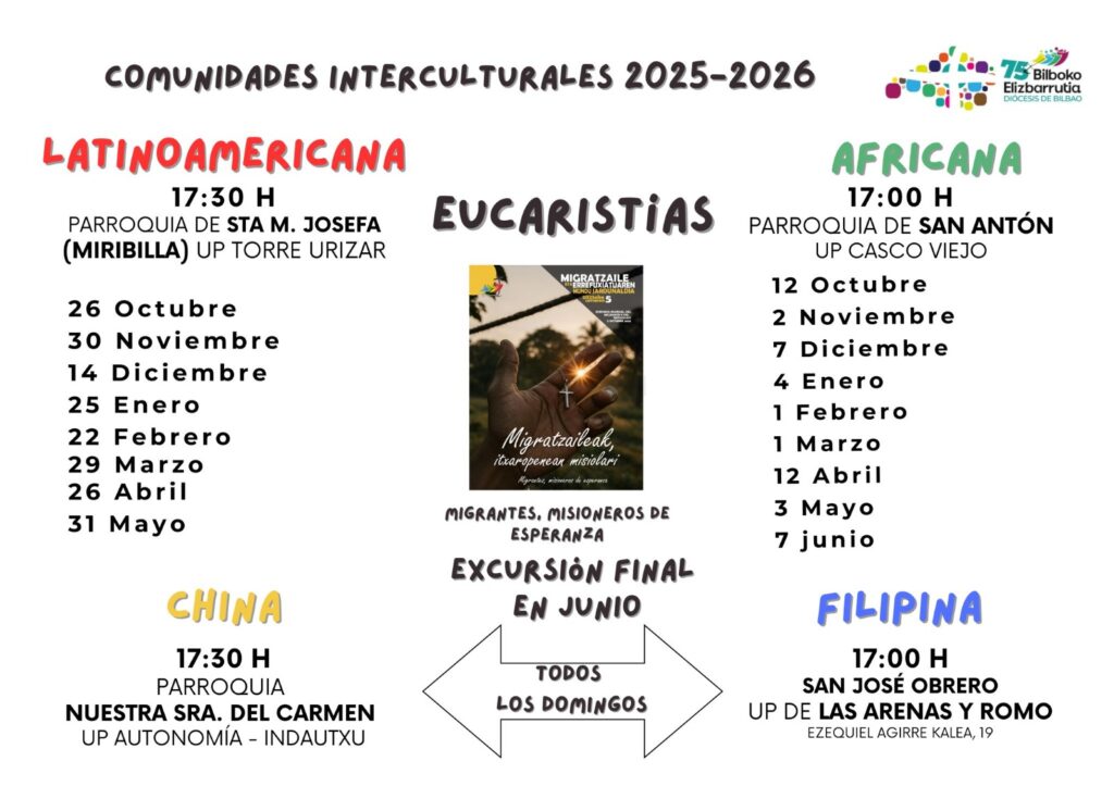 - Latinoamericana: último domingo de mes, a las 17:30 h, en la parroquia Santa María Josefa (Miribilla)