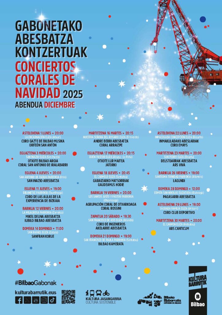 Desde hoy y a lo largo del mes de diciembre, los conciertos corales de Navidad volverán a llenar de música los barrios de Bilbao. Se podrá disfrutar de un total de 18 conciertos, ofrecidos por agrupaciones locales, en diferentes iglesias de Bilbao. Programa completo en el cartel que acompaña estas líneas. Esta iniciativa navideña está organizada por el ayuntamiento, con la colaboración de la diócesis de Bilbao, dentro del programa KULTUR GABONAK. Toda la información y programación completa: aquí.