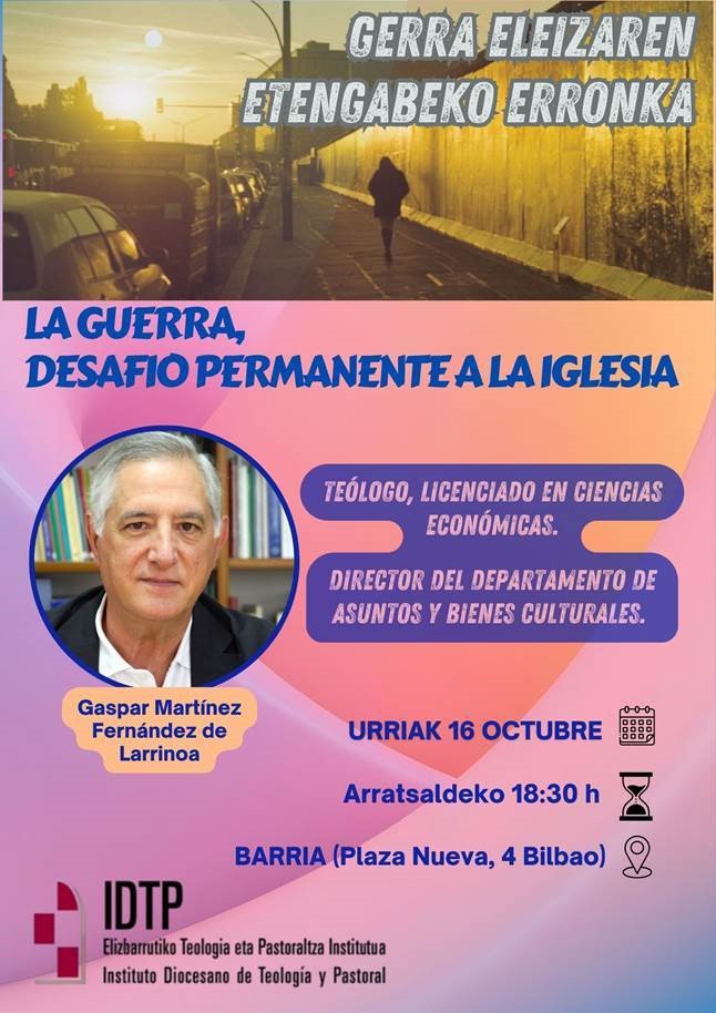 “La guerra como desafío permanente a la Iglesia/Gerra Eleizaren etengabeko erronka”, es el título de la conferencia que impartirá este jueves, 16 de octubre, a las 18:30, en Barria (Plaza Nueva, 4. Bilbao) el presbítero diocesano Gaspar Martínez Fernández de Larrinoa.