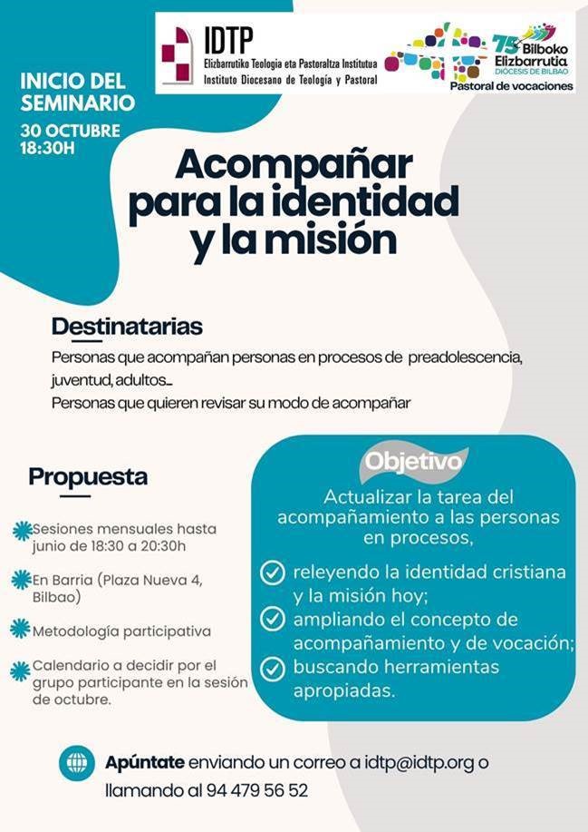 Este próximo jueves, 30 de octubre, a las 18:30 h., comenzará el Seminario “Acompañar para la identidad y la misión”, organizado por el Instituto Diocesano de Teología y Pastoral junto a Pastoral Vocacional. Tendrá lugar en Barria (Plaza Nueva, 4, de Bilbao) y esta dirigido, principalmente a personas que acompañan procesos de preadolescencia, juventud y adultos y a quienes quieran revisar su modo de acompañar.