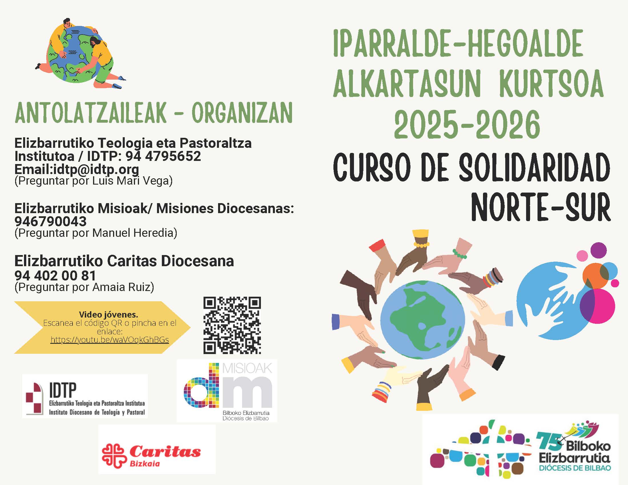 Esta tarde, a las 19:30 en Barria (Plaza Nueva, 4. 1º) tendrá lugar la presentación de una nueva edición del curso de formación Norte Sur, que organizan el Instituto Diocesano de Teología y Pastoral (IDTP), Misiones Diocesanas y Cáritas Bizkaia. Aprovechamos también para anunciar la Mesa Redonda de testimonios misioneros que, con motivo del DOMUND tendrá lugar el próximo jueves, 9 de octubre, en el mismo lugar, a las 18:30 h., promovida por la delegación de Misiones y por el área de Migraciones de la delegación de Caridad y Justicia.